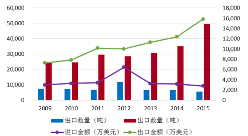 其中常用規(guī)格的涂覆鋁板歸類為“其他鋁合金板、片及帶,厚度超過(guò)0.2毫米”。該類產(chǎn)品主要包含有厚度超過(guò)0.2毫米的涂覆鋁板、鋁合金板、鋁片、鋁板、鋁合金片、鋁圓片、鋁塑板及鋁合金卷材等,其出口量近年呈持續(xù)增長(zhǎng)趨勢(shì)、進(jìn)口量從2012年起逐漸降低,具體如下: